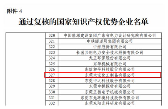 喜報!東莞大寶化工通過國家知識產權優勢企業復核
