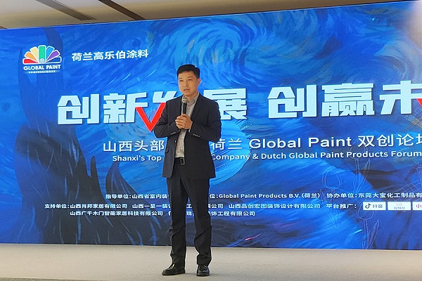 東莞大寶化工經銷事業部副總經理葉子琛代表荷蘭高樂伯涂料對嘉賓的到來表示熱烈歡迎,并提到當前行業挑戰和政策調整的影響,表示山西鑫樂誠舉辦此次品牌推廣活動,令他和高樂伯總裁Mr.Kees深受感動和鼓舞。
