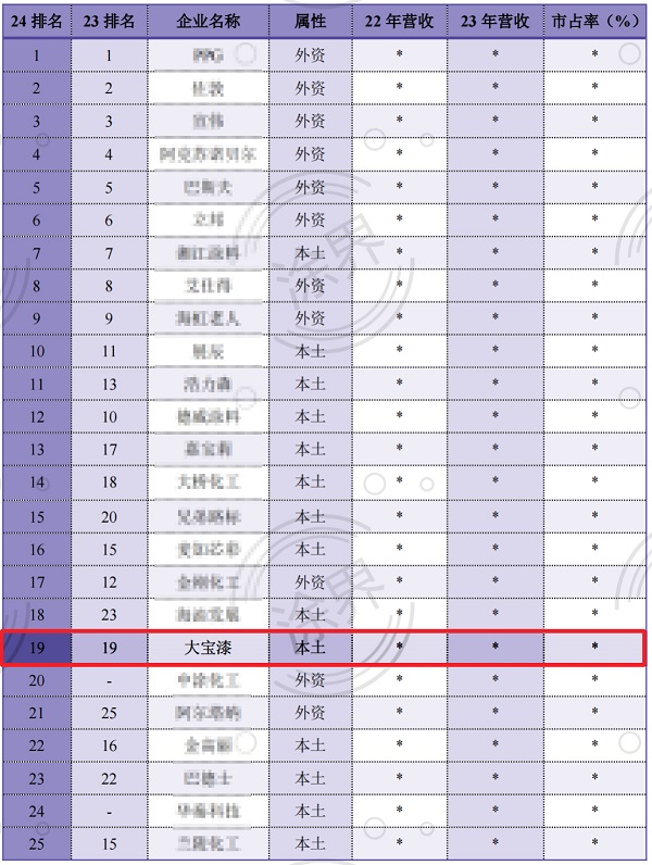 近日,國內涂料行業專業財經媒體《涂界》發布“2024中國工業涂料品牌25強榜單”,榜單匯聚了國內最具影響力的工業涂料品牌。其中,大寶漆今年位列第19名,連續兩年蟬聯中國工業涂料前二十強。(數據來源:涂界