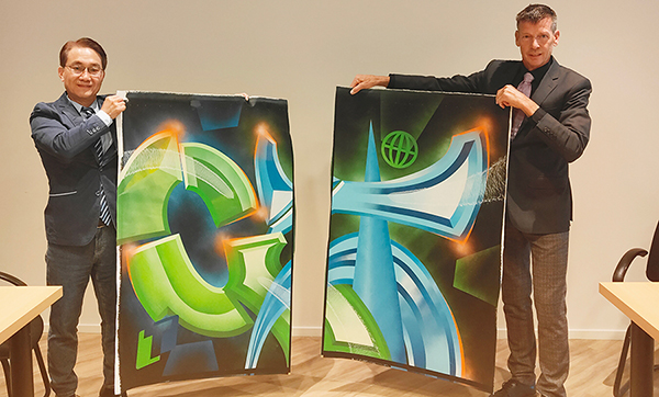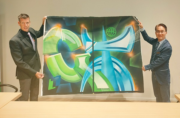 此次簽約儀式別具創(chuàng)意與情感意義,高樂伯總裁Kees特別邀請當?shù)刂嫾乙浴癎”與“T”兩個字母為主題,分別代表Global Paint與Taiho Paint,創(chuàng)作一幅融合東西方藝術語匯的油畫作品。簽約當日,雙方代表共同剪下畫作中央,各自保留一半,象征兩家企業(yè)跨越地域、文化的深度連結(jié)。