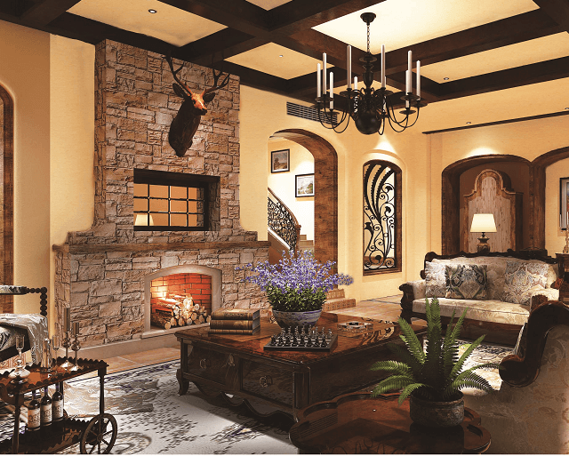 由于美國人喜歡有歷史感的東西,因此美式風格崇尚仿古,這不僅反映在軟裝擺件上對仿古藝術品的喜愛,同時也反映在裝修上對各種仿古墻地磚、石材的偏愛和對各種仿舊工藝的追求上,如美式風格的墻面裝修,喜歡使用大寶米蘭珠光石系列藝術壁材等材料,營造紋理萬千、天然去雕飾的仿石效果。