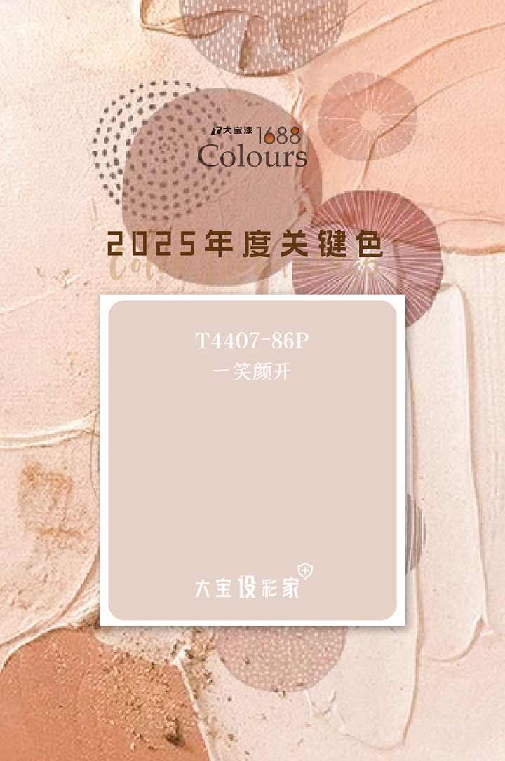 厭倦了一成不變的大白墻?不妨試試讓人一見傾心的粉色系!大寶設彩家2025年推薦色T4407-86P/一笑顏開(類似藕粉色),以其獨特的柔和質感將優雅時髦大放異彩,藕粉色是經典的中性色,色調介于粉色與肉色之間,因其加入了灰調,明度降低,仿佛是沙漠中的一抹晚霞,帶著灰紫色的沉靜典雅,又透露著粉色的柔美知性。
